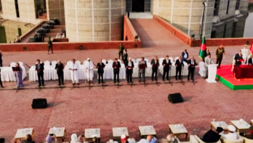 বাংলাদেশের ইতিহাসে প্রথমবারের মতো সংসদ ভবনের খোলা মাঠে প্রধানমন্ত্রী ও মন্ত্রিসভার সদস্যরা শপথ গ্রহণ করেছেন। সংসদ ভবনের দক্ষিণ প্লাজায় এই শপথ অনুষ্ঠানে দেশ বিদেশের অতিথিরাও অংশ নিয়েছেন
